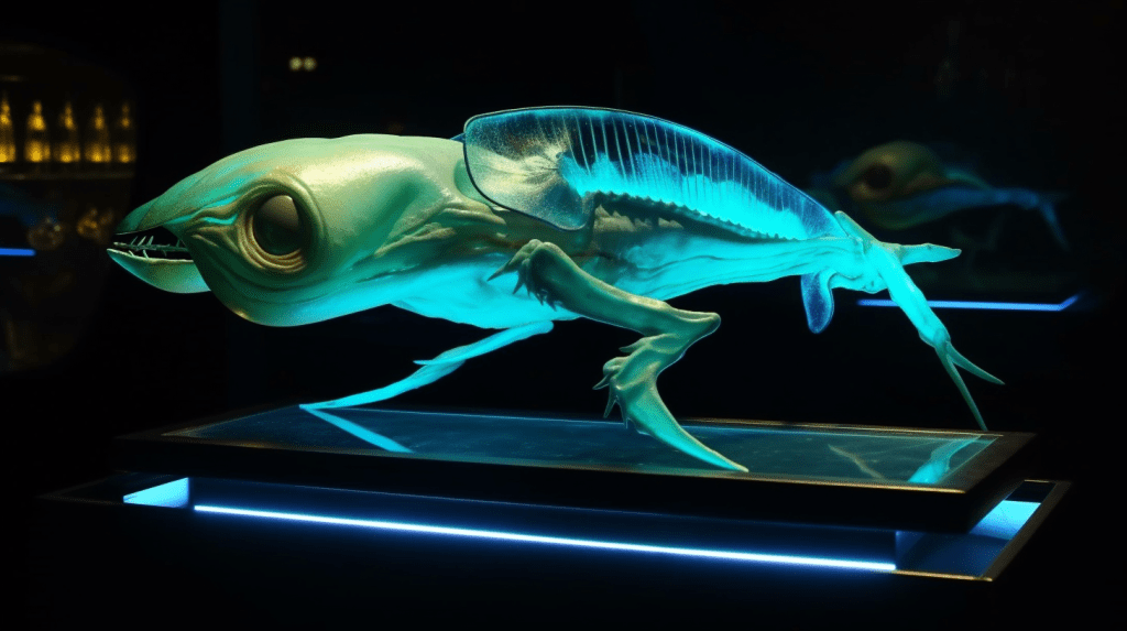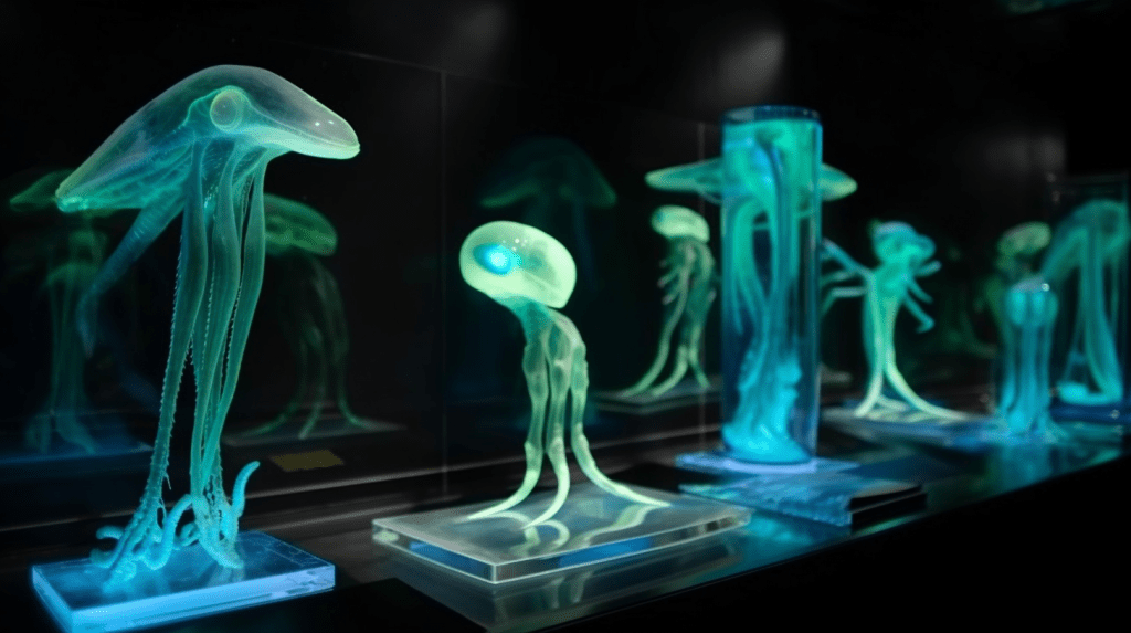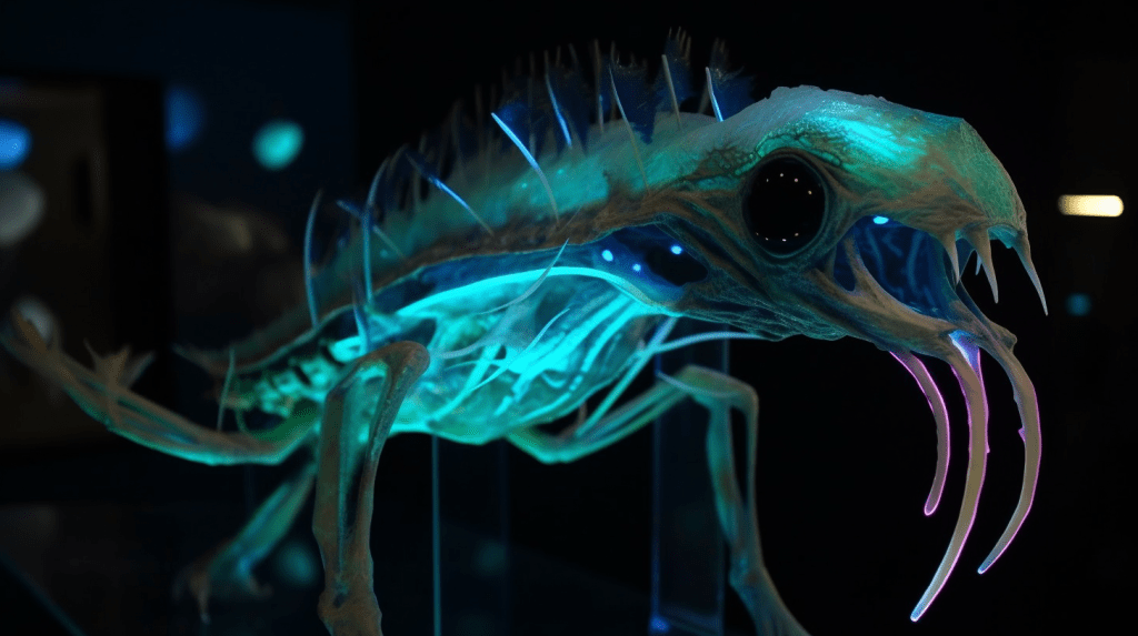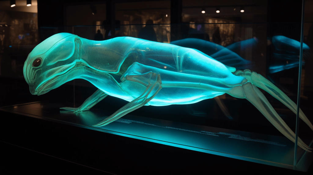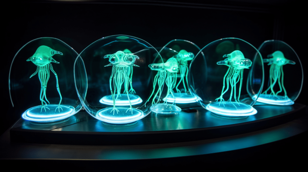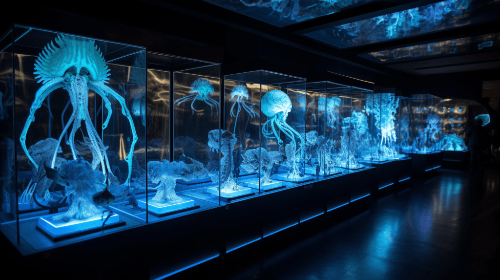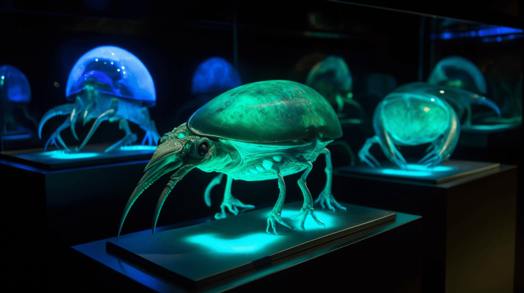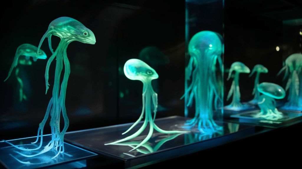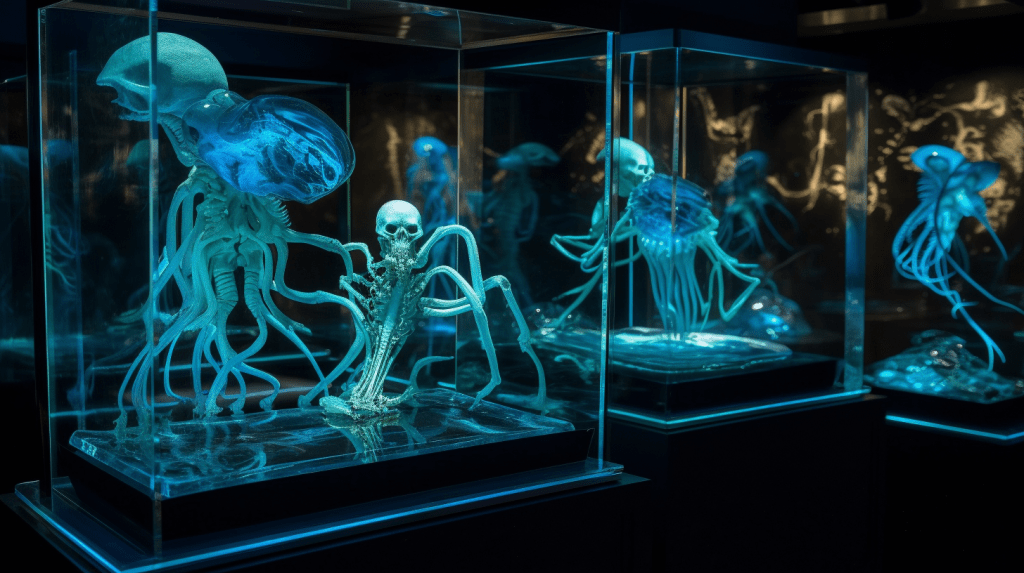 Step into the mesmerizing world of “Celestial Glow,” where the beauty of bioluminescence reigns supreme. The Xenobiology Museum is proud to present a dazzling collection of preserved specimens of non-humanoid alien species that emit an otherworldly glow. These creatures are marvels of nature, possessing the ability to create light through chemical reactions within their bodies, a process known as bioluminescence.