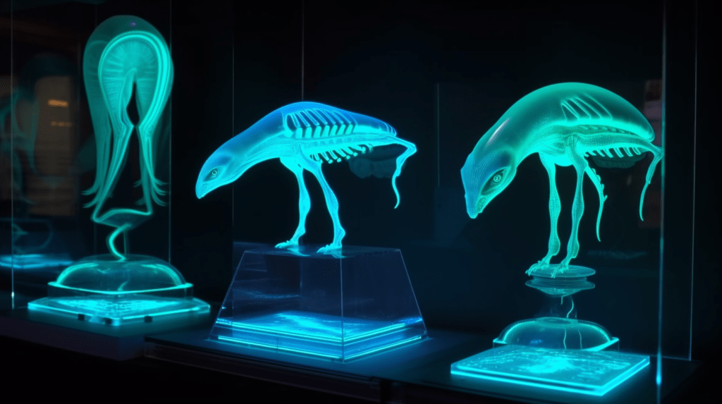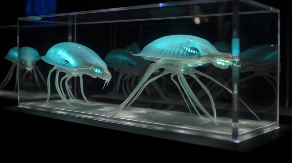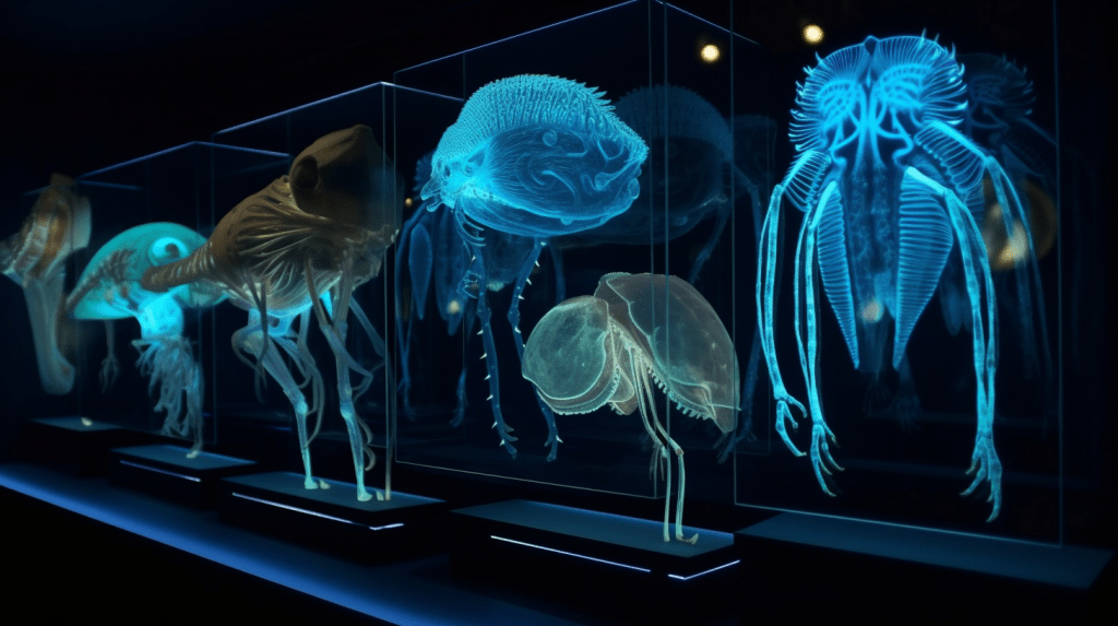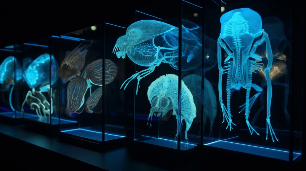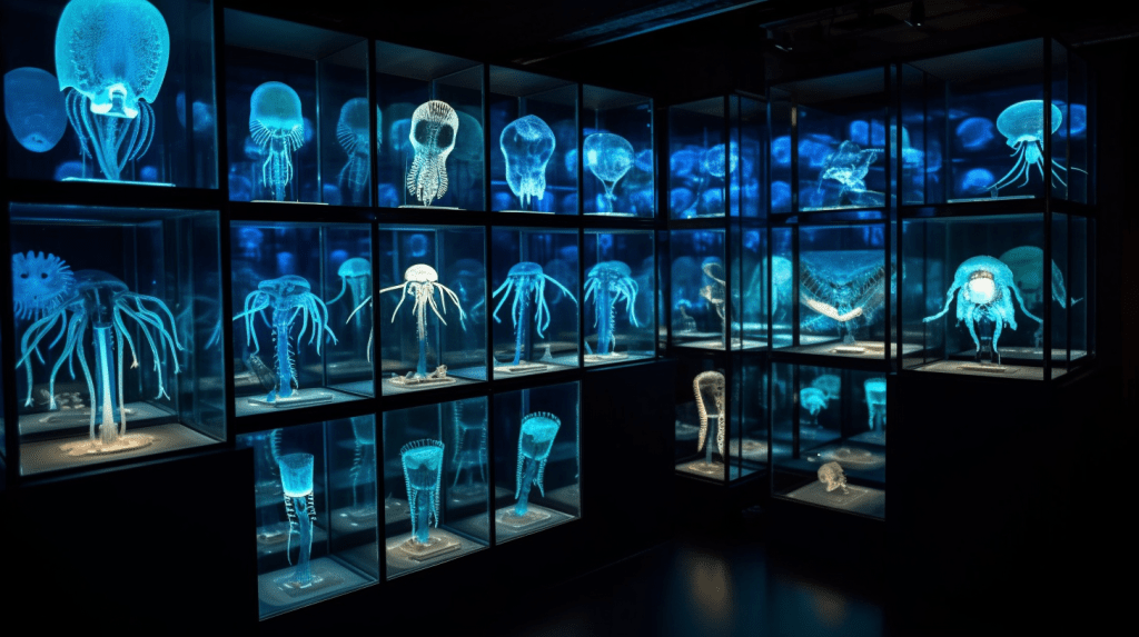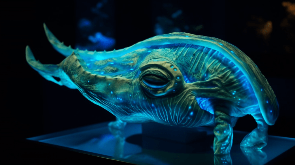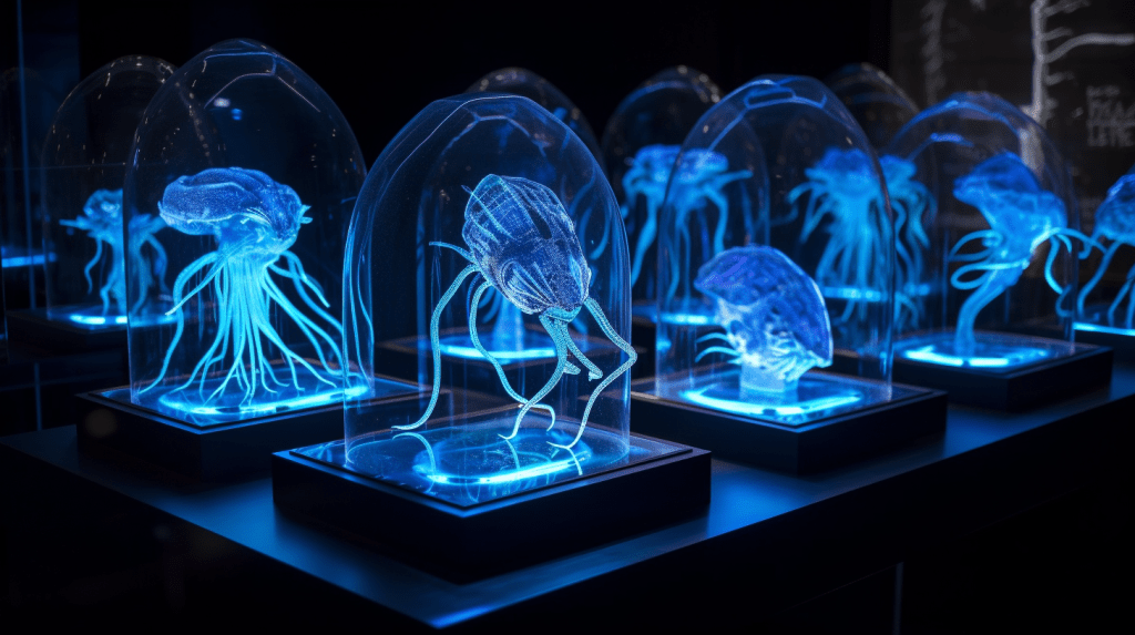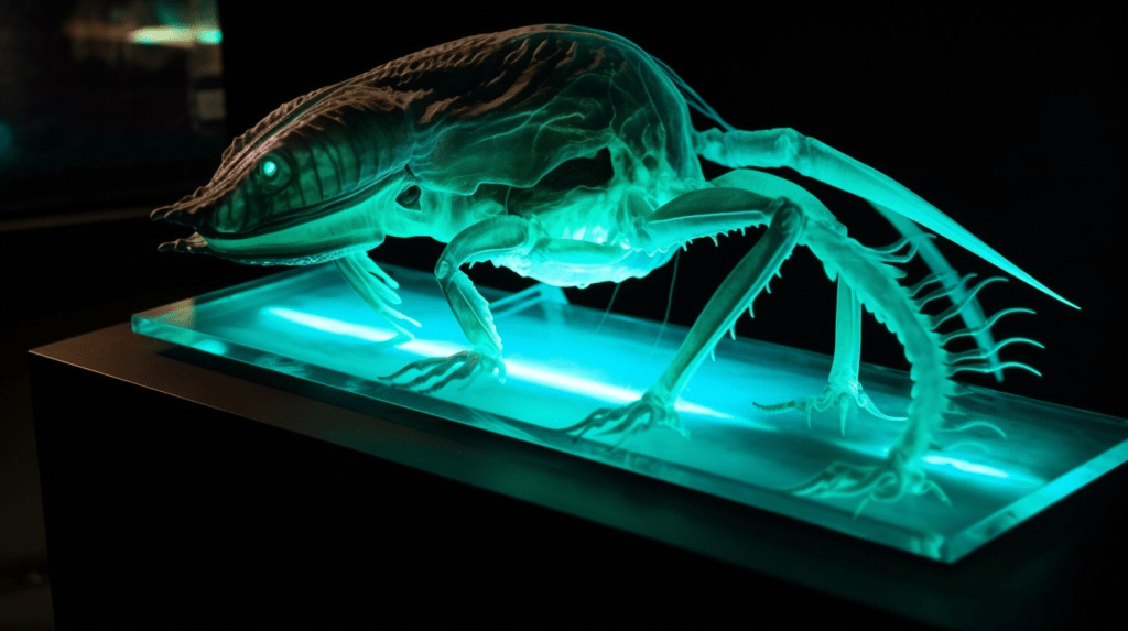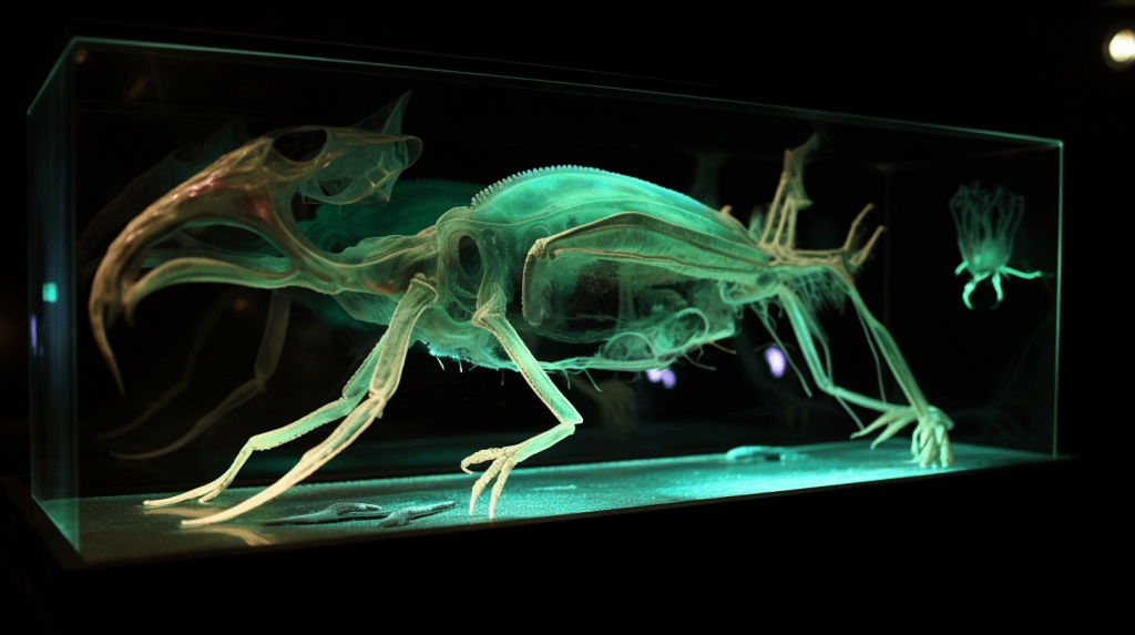 Step into the mesmerizing world of “Celestial Glow,” where the beauty of bioluminescence reigns supreme. The Xenobiology Museum is proud to present a dazzling collection of preserved specimens of non-humanoid alien species that emit an otherworldly glow. These creatures are marvels of nature, possessing the ability to create light through chemical reactions within their bodies, a process known as bioluminescence.