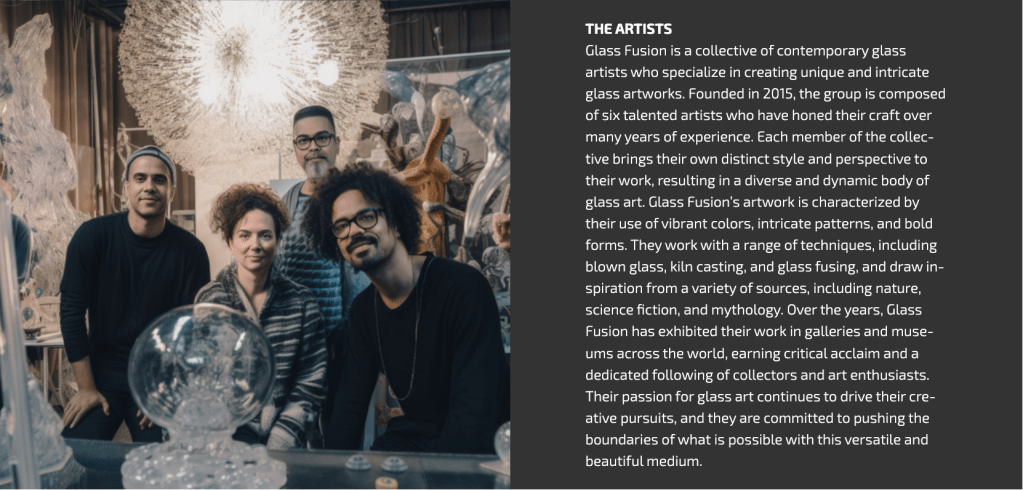 And here is the result at the end of the page displaying the photos of her Xenoglass exhibit, combining the name and biography generated by ChatGPT and the photo generated by MidJourney: