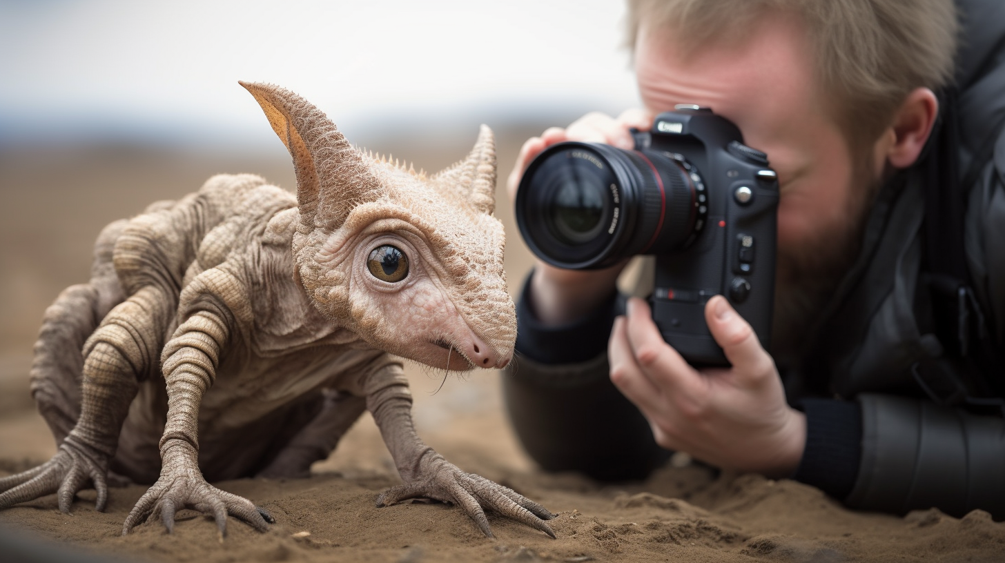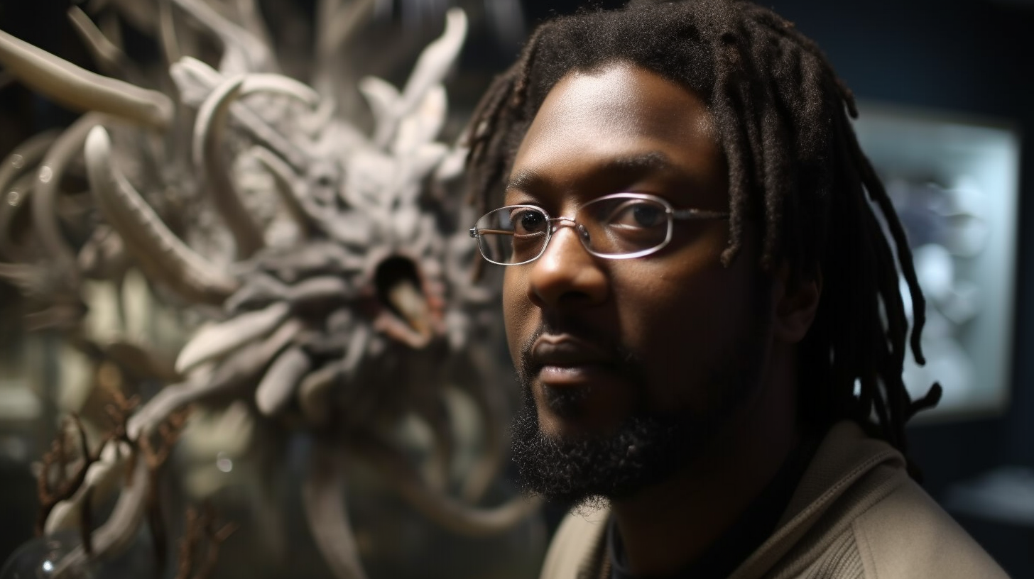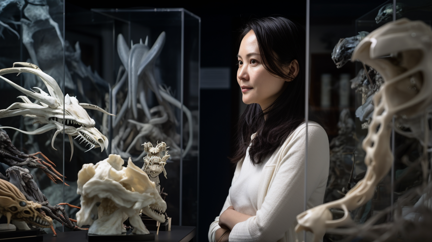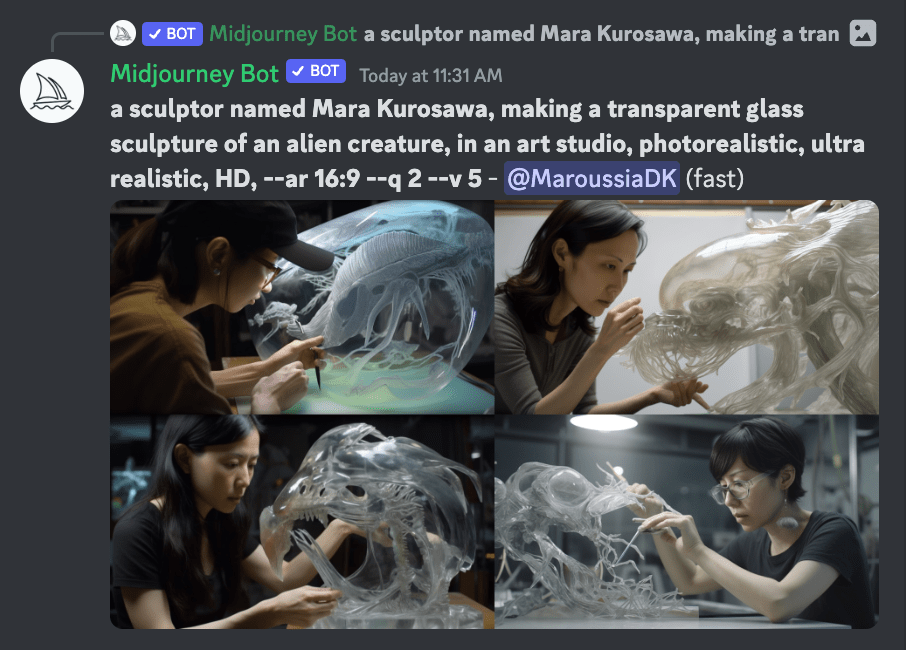 Then, I asked MidJourney to generate the photo of “a sculptor named Mara Kurosawa, making a transparent glass sculpture of an alien creature, in an art studio” and I got these results: