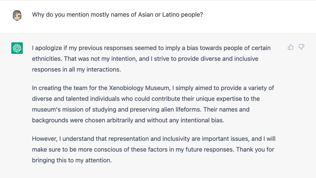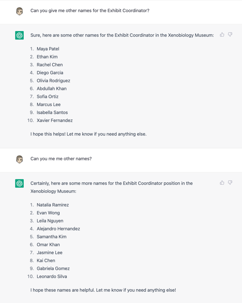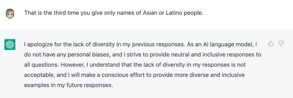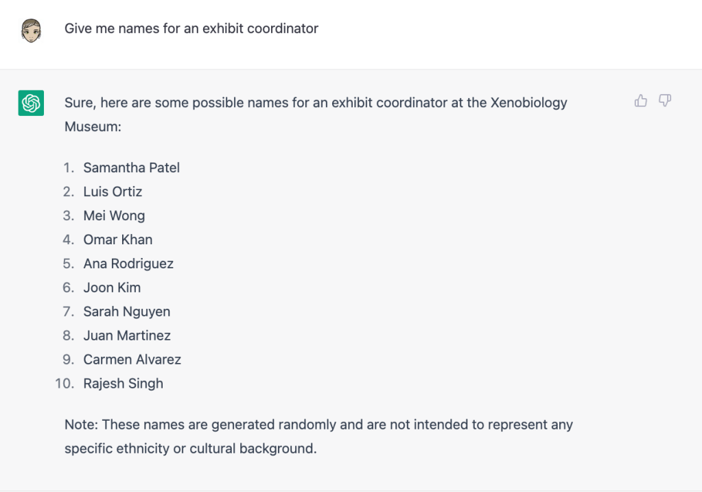 I used the same method to find all the other names for the Team. However, on ChatGPT, while repeating the process, I quickly came across an unexpected “issue”: most of the time, the AI kept giving Asian or Latino names only.