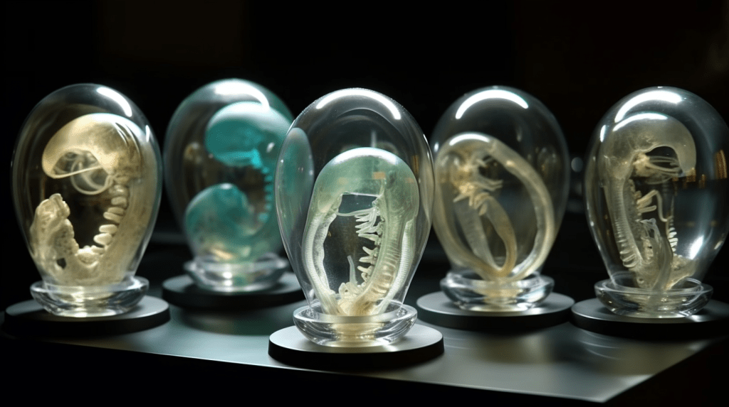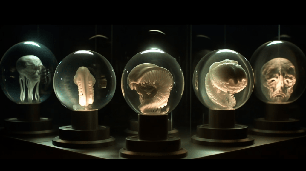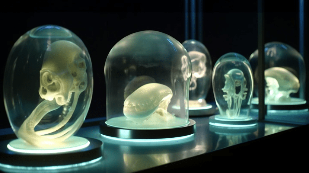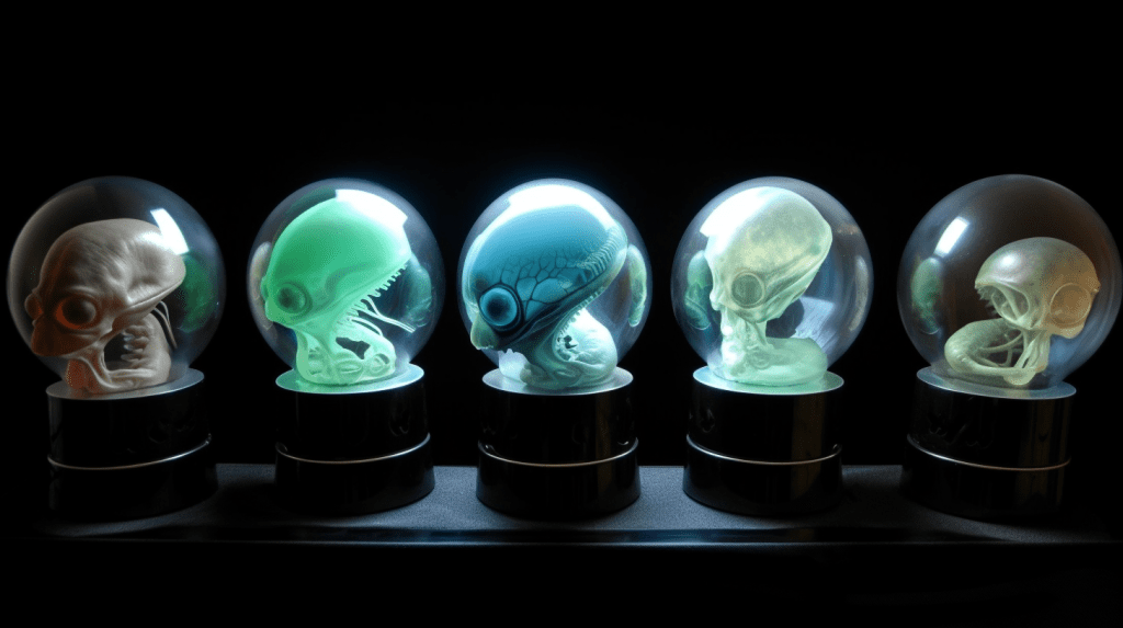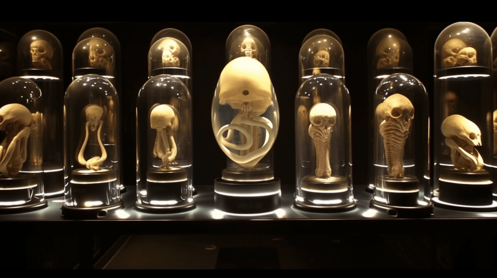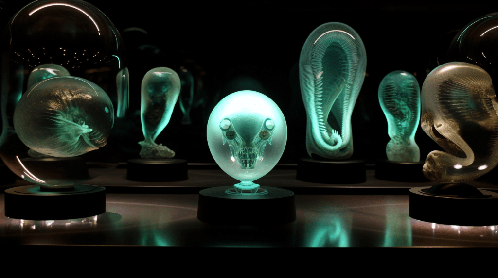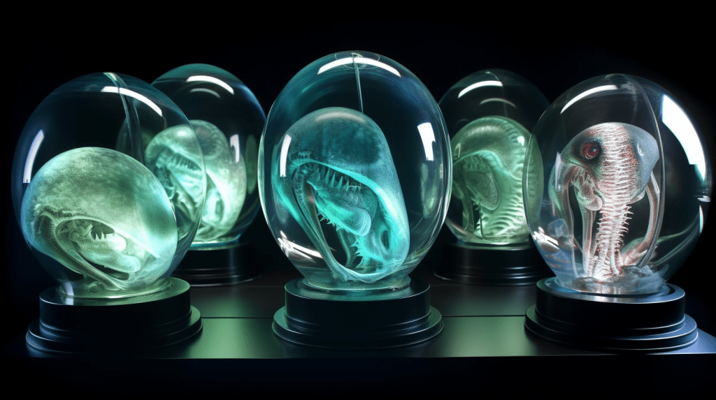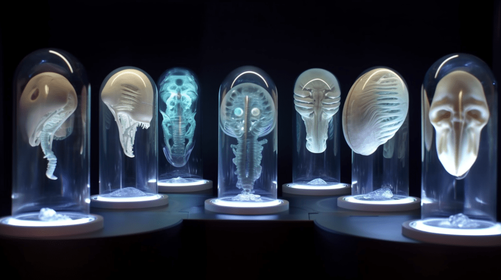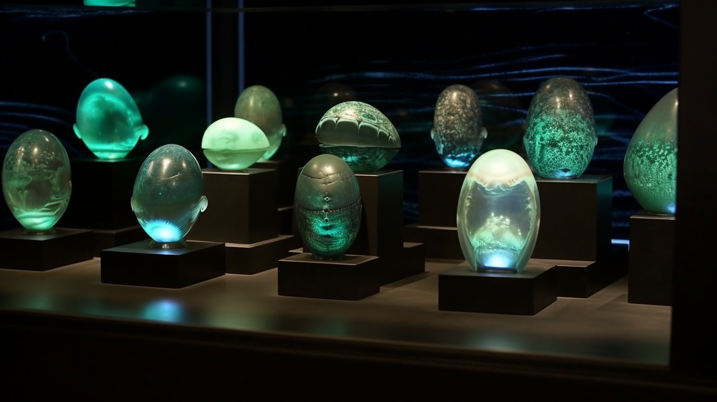 Welcome to The Incubation Room, the Xenobiology Museum’s exhibit on Alien Embryos. Here, we delve into the complex world of extraterrestrial reproduction and development. Our collection showcases preserved specimens of various extraterrestrial embryos, each with their unique features and characteristics. Studying alien embryos presents a unique challenge, as they differ significantly from terrestrial embryos in their anatomy and physiology. Our team of specialists uses advanced vitrification techniques to preserve these delicate specimens, ensuring that their structures remain intact and allowing us to study their development. The exhibit highlights the diversity of alien embryonic development and the many ways in which these creatures have adapted to their environments. Visitors can observe the intricate structures and mechanisms involved in extraterrestrial reproduction, gaining a deeper understanding of the complexity of alien life. Join us on this journey of discovery into the fascinating world of alien embryology.